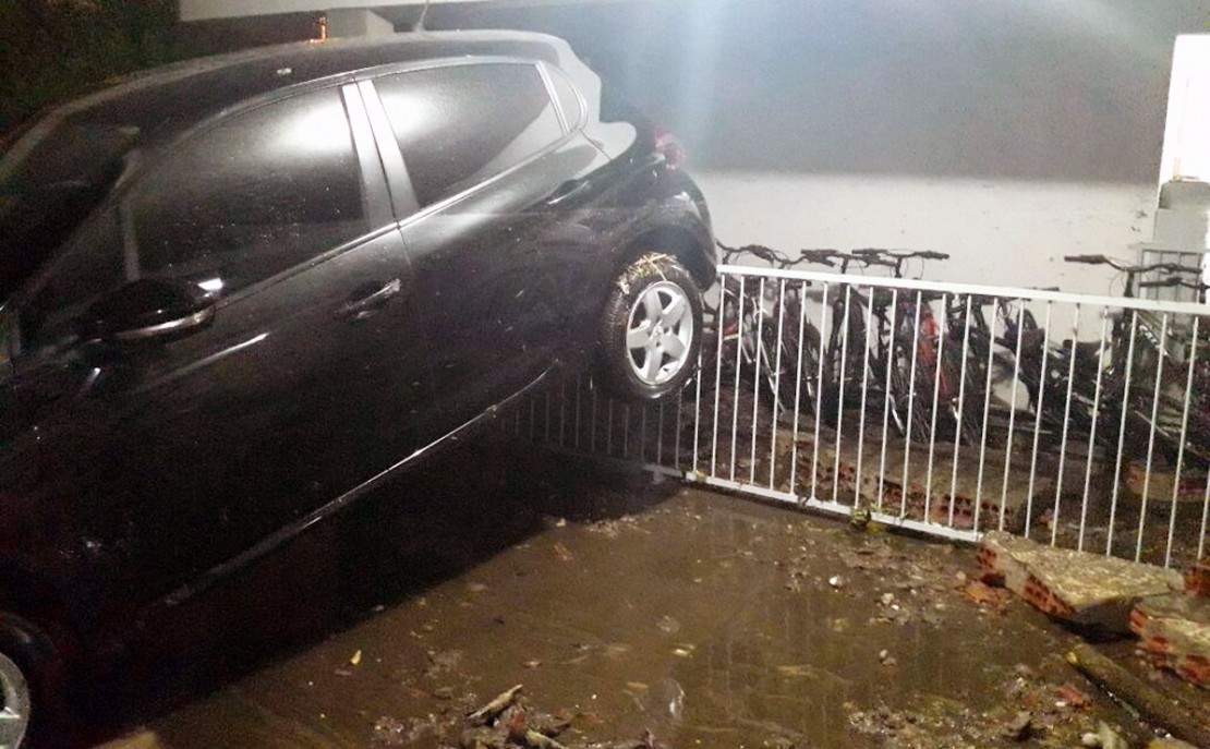 O cenário de destruição na garagem do prédio impressionava. A força da água foi tamanha, que um dos carros chegou a ficar pendurado numa grade que divide a área do bicicletário das garagens comuns. “Prejuízo certo para os moradores”, comentou Leandro.
