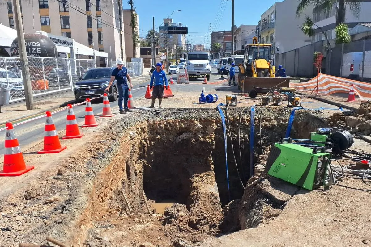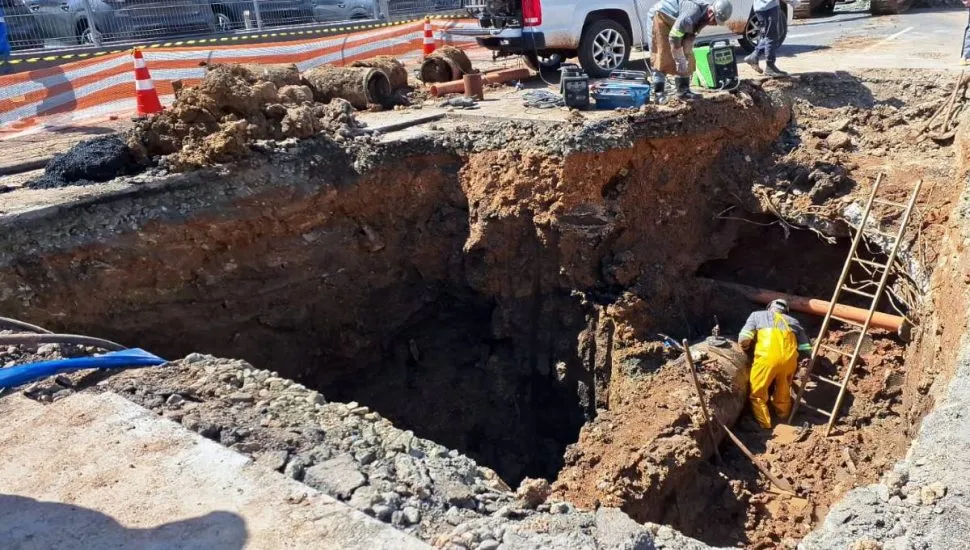 Confira a galeria de fotos feitas pelo repórter fotográfico Átila Alberti, da Tribuna. As imagens mostram a dimensão da obra, com trabalhadores operando no fundo da escavação. A profundidade do buraco impressiona quem passa pelo local, evidenciando a complexidade do trabalho de manutenção da rede de água.