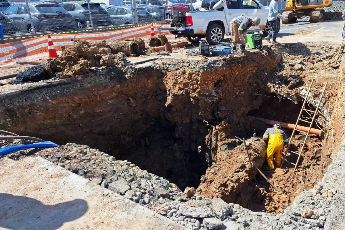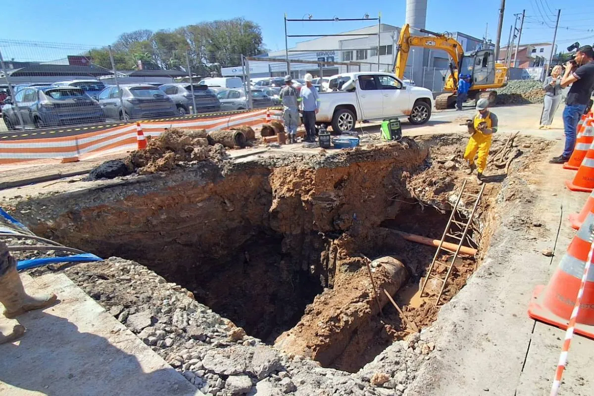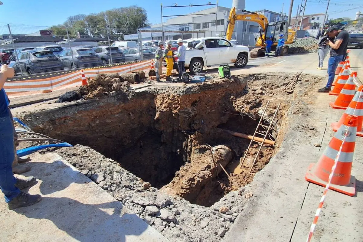 Segundo a Sanepar a escavação para o acesso à tubulação rompida tem pontos entre 2 e 2,5 metros de profundidade. Para o conserto, é necessária a produção de uma peça específica, com encaixe adequado ao tubo que já existe no local, e, posteriormente, a solda dessa peça nova à rede existente, realizando a vedação completa da fissura da adutora.
