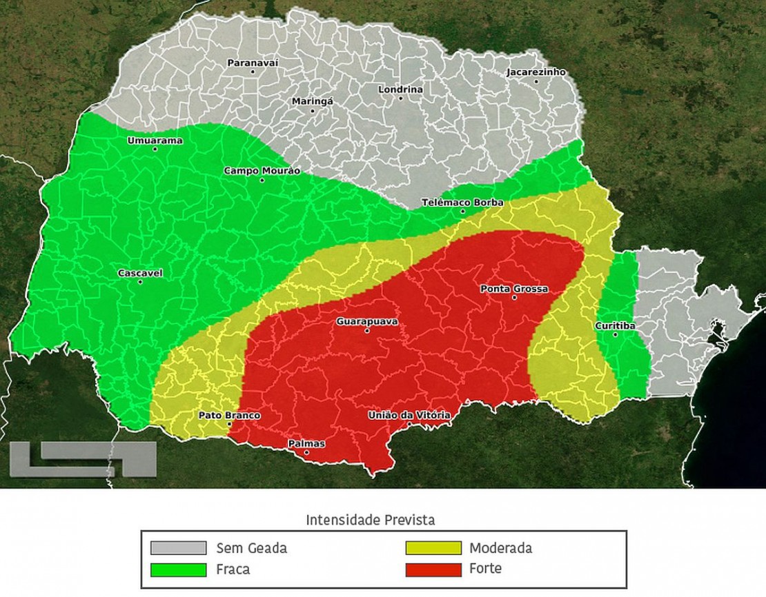 No Sudoeste, partes da região Central e na região de Curitiba a previsão é de geada moderada e em outras regiões, até Noroeste, Oeste e Norte Pioneiro, pode ocorrer geada fraca. A massa de ar polar evolui sobre o Paraná e neste sábado até cidades conhecidas por sua temperatura elevada podem ter mínimas próximas do Zero Grau, como Foz so Iguaçu, Umuarama e Maringá.