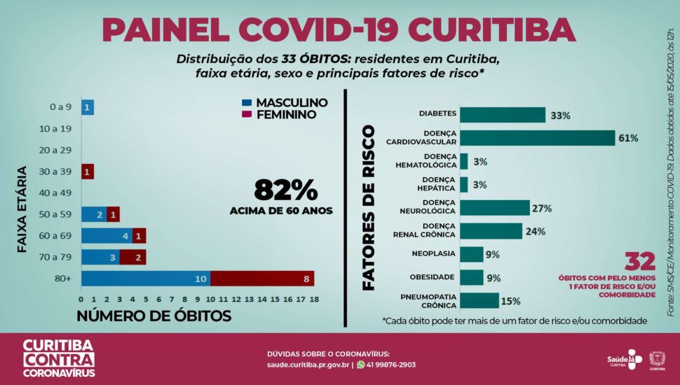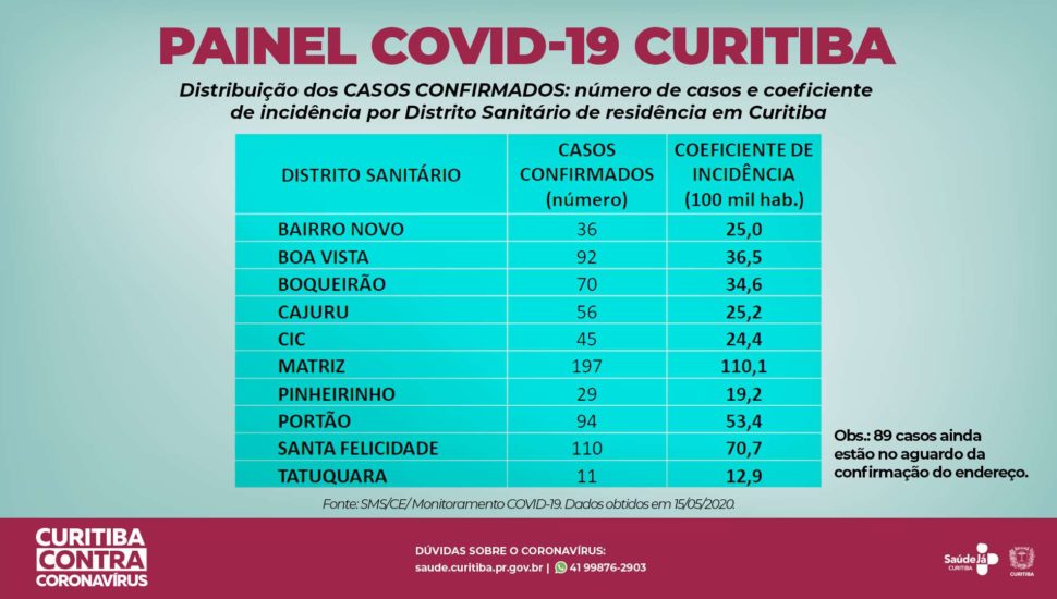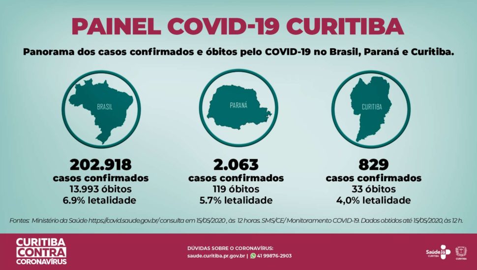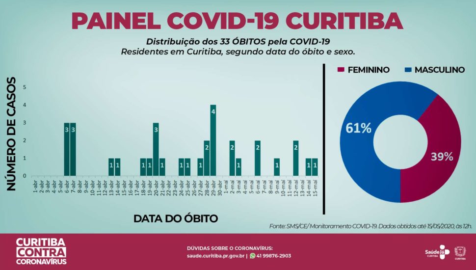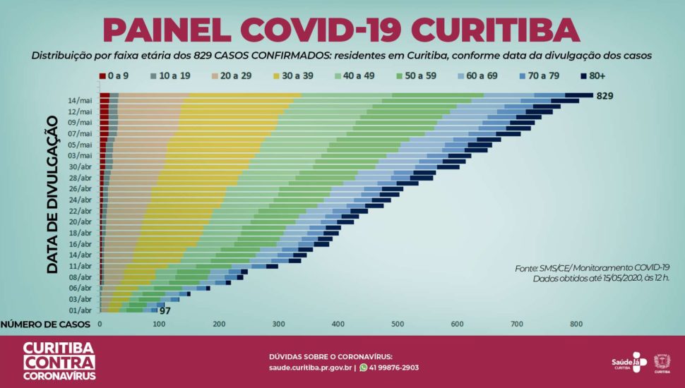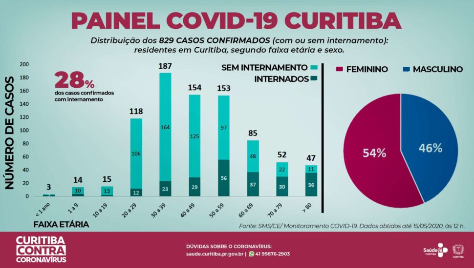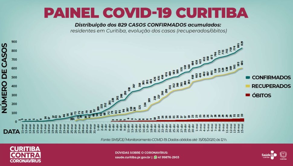 Curitiba chega a marca de 605 pessoas recuperadas após infecção pelo novo coronavírus, nesta sexta-feira (15). Com o acréscimo de 24 novos resultados positivos, a capital tem hoje o total de 829 casos oficiais. Duas novas mortes também foram confirmadas no boletim diário divulgado pela Secretaria Municipal de Saúde (SMS), o que aumenta para 33 a soma de óbitos por covid-19 desde o dia 11 de março.