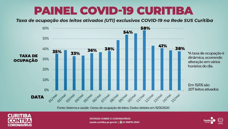 De acordo com a SMS, a taxa de ocupação dos leitos em UTI para pacientes com coronavírus ou com suspeita da doença é de 38% nesta sexta-feira (15), com 207 leitos de UTI ativados. Esses leitos fazem parte de um total de 237 previstos para pacientes com sintomas e confirmados com a infecção. As 30 unidades restantes serão ativadas conforme a evolução dos casos.