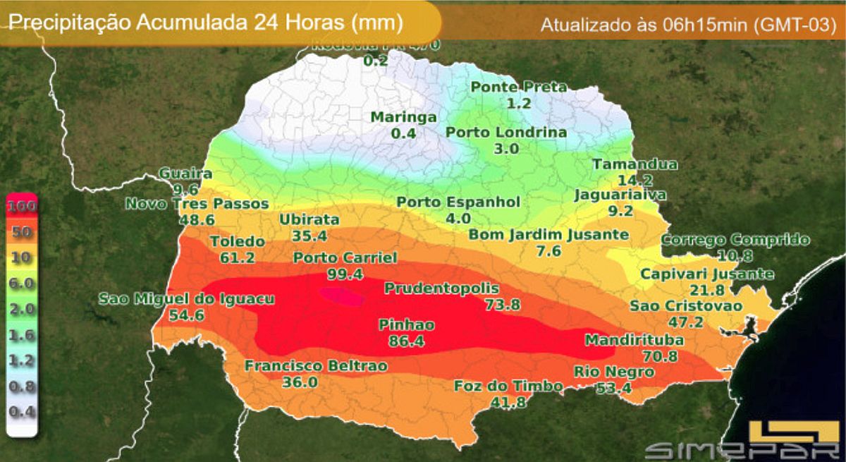 O dia segue chuvoso, segundo o Simepar, por conta do gradual e lento avanço das áreas de instabilidade pelo Paraná. “A tendência é de que a precipitação ser expressiva em vários setores, com valores acumulados acima dos 30 mm em muitas cidades. Inclusive não se descarta transtornos a população, com alagamentos em alguns municípios”, diz o órgão.