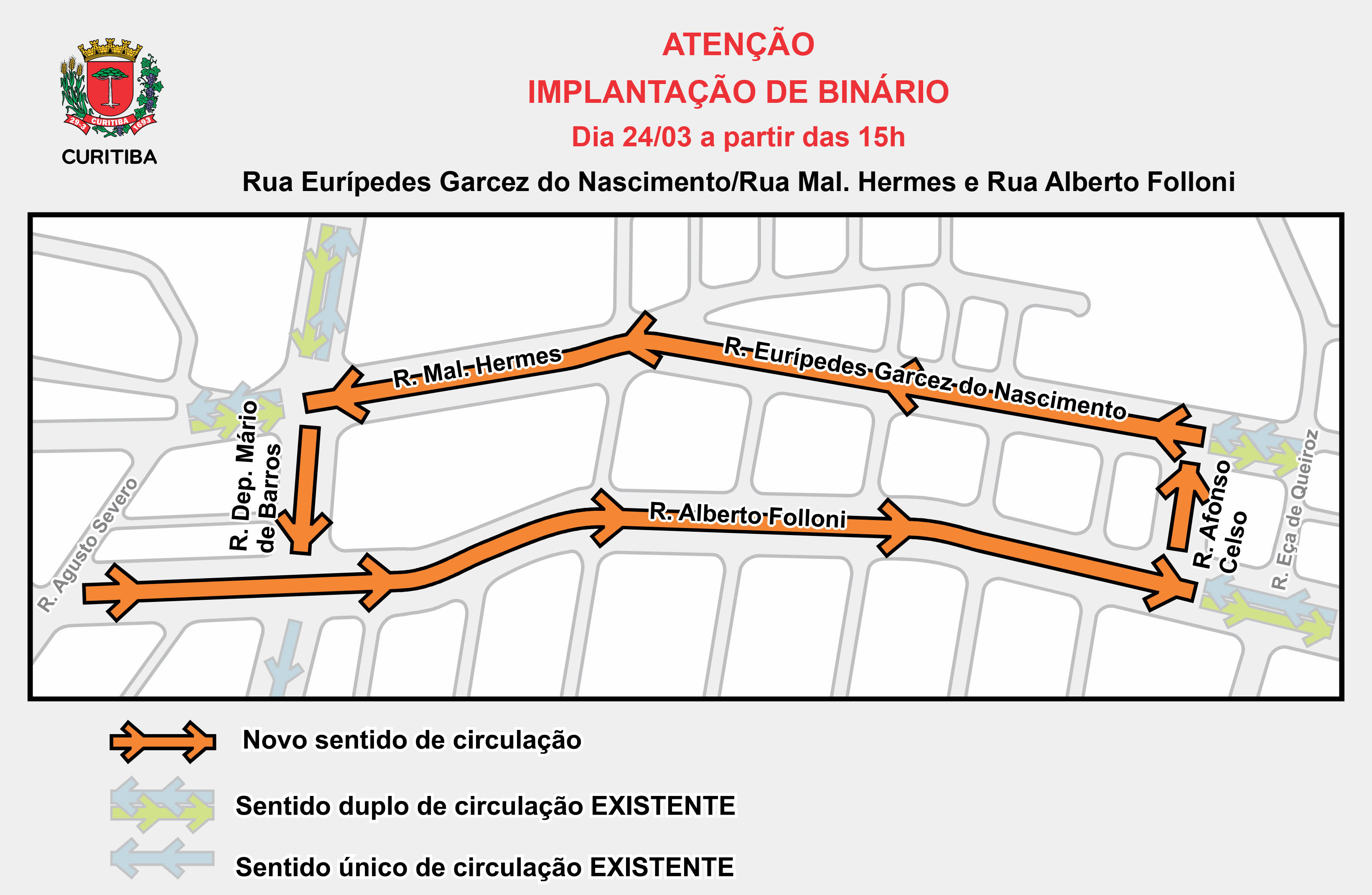 As ruas transversais, no início e no fim do binário, também passam a ter sentido único de circulação para os veículos: na Afonso Celso, o motorista poderá seguir da Alberto Folloni para a Eurípedes Garcez do Nascimento. No extremo oposto, a Rua Deputado Mário de Barros passa a ter sentido único da Marechal Hermes para a Alberto Folloni.