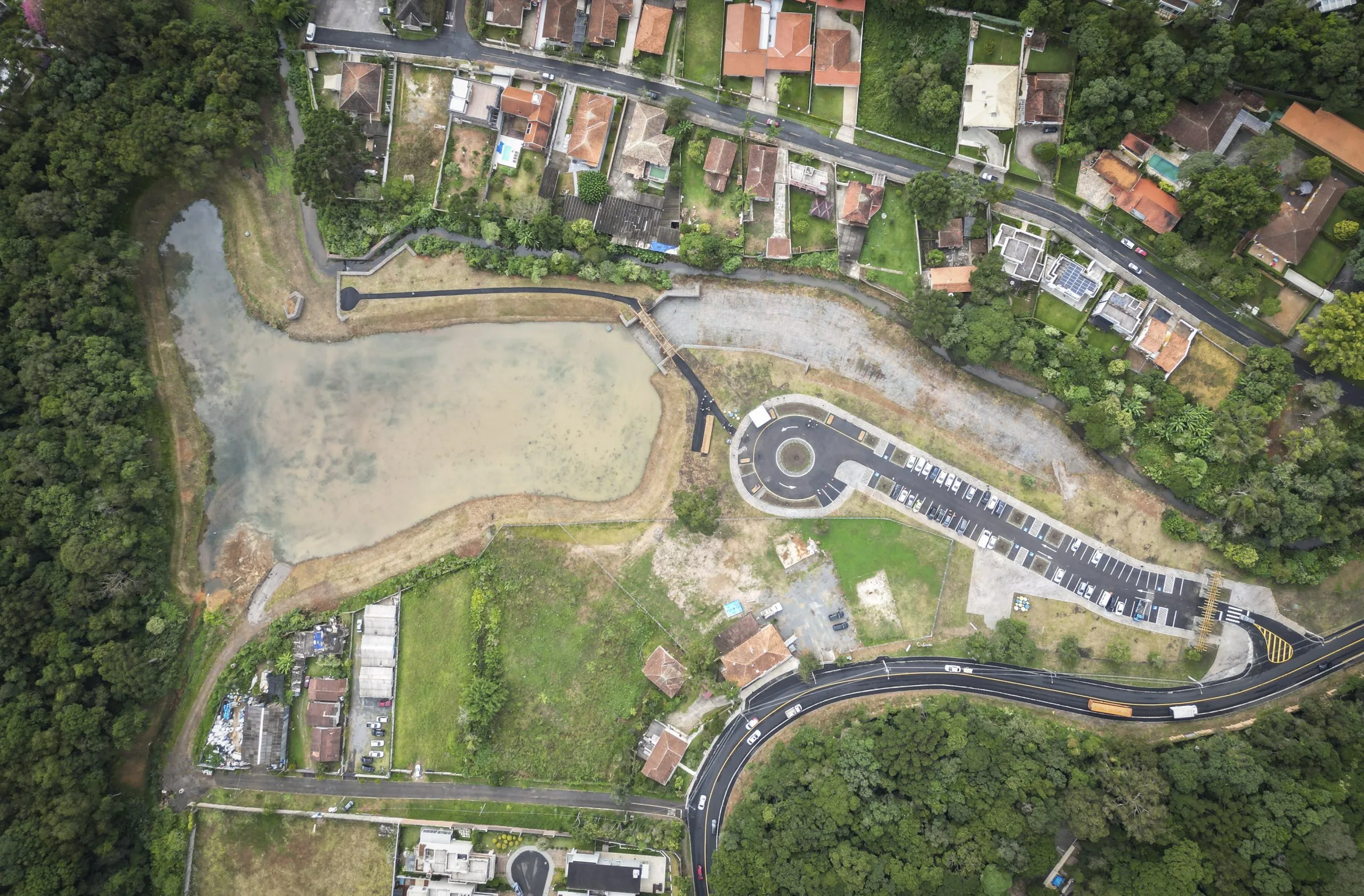 Logo na entrada, um portal rústico, com elementos naturais, recebe os visitantes da área que também recebeu jardins de chuva, pista de caminhada, uma pequena arquibancada construída com materiais naturais, ponte sobre o lago, iluminação e estacionamento.