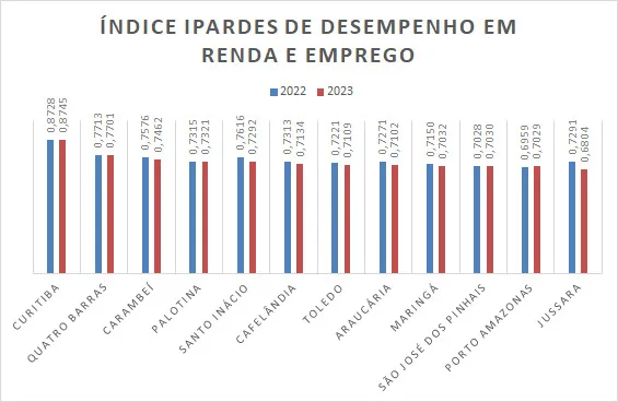 Curitiba conquistou o primeiro lugar no ranking geral e de renda do Índice Ipardes de Desempenho Municipal (IPDM) 2023, divulgado nesta terça-feira (18/11) pelo Instituto Paranaense de Desenvolvimento Econômico e Social (Ipardes). A capital paranaense obteve nota 0,8231 no desempenho geral, seguida por Palotina (0,7935), Quatro Pontes (0,7771), Cafelândia (0,7771) e Toledo (0,7657).