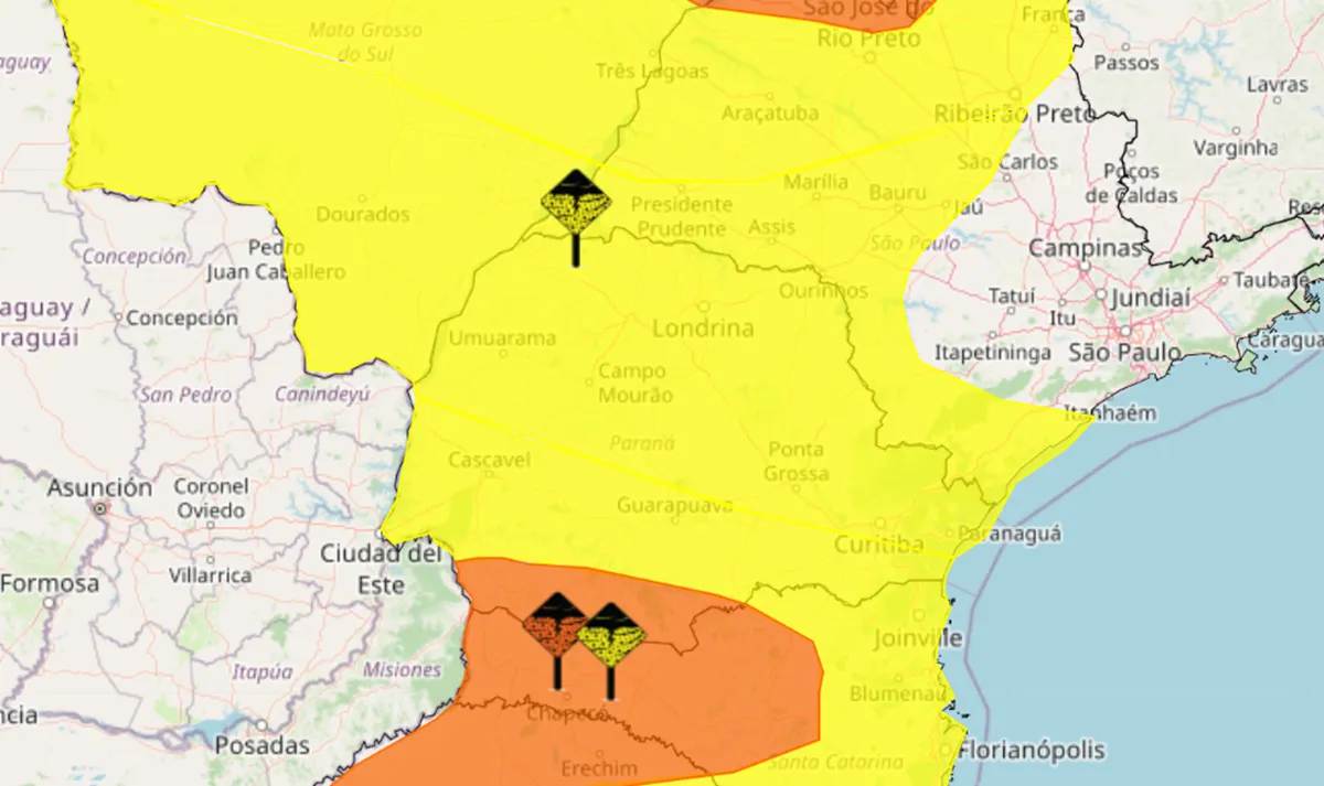 Nas regiões Sudoeste Paranaense, Sudeste Paranaense e Centro-Sul Paranaense o alerta é de cor laranja, o que significa a chance de uma tempestade mais perigosa, com ventos de até 100 km/h.