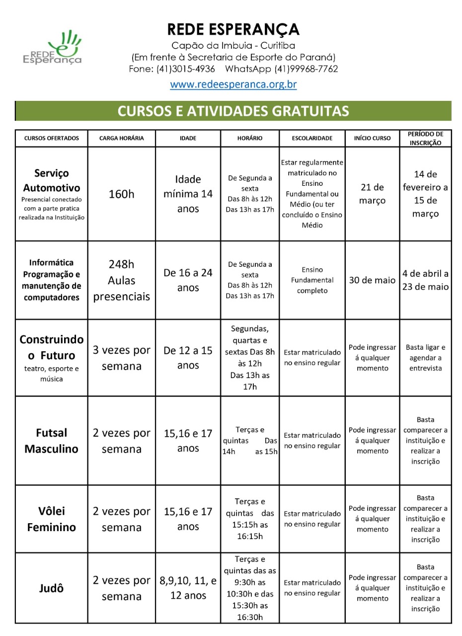 A Rede Esperança, uma instituição sem fins lucrativos, está oferecendo diversos cursos profissionalizantes para jovens com mais de 16 anos que pretendem ingressar no mercado de trabalho. Além destes cursos, também tem projetos voltados a adolescentes de 12 a 15 anos e também para a comunidade em geral.