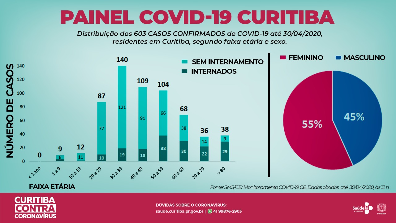 O boletim diário da Secretaria Municipal de Saúde de Curitiba (SMS) apontou, na tarde desta quinta-feira (30), mais quatro mortes e 40 novos casos de novo coronavírus na cidade, dados que representam o maior número de óbitos e de confirmações da doença em um único dia, desde os primeiros registros no dia 11 de março. Ao todo, já são 23 as mortes confirmadas por covid-19 na capital e 604 as pessoas infectadas. As novas vítimas fatais são uma mulher de 69 anos e três homens, com 77, 81 e 82 anos de idade. Todos eles, com histórico de outras doenças crônicas, como informa a SMS.