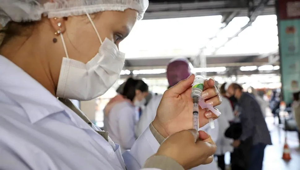 Funcionária abastece uma seringa de vacina contra a gripe, com várias pessoas ao fundo, em um terminal de ônibus