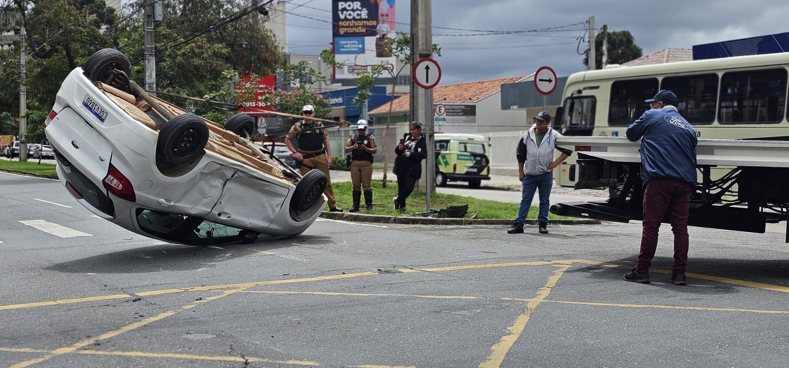Uma colisão de trânsito na manhã deste sábado (27) devido a desatenção de um motorista na Avenida Silva Jardim, esquina com Ângelo Sampaio, no bairro Água Verde, resultou em um carro capotado. Ninguém saiu ferido com a batida.