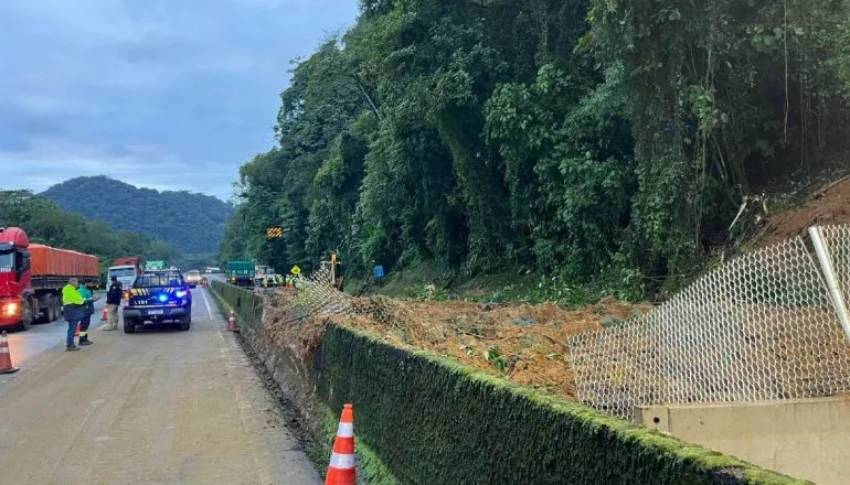 O local da queda de talude está sinalizado e os motoristas recebem orientações na praça de pedágio. O trânsito flui em uma faixa para cada lado no trecho do deslizamento.