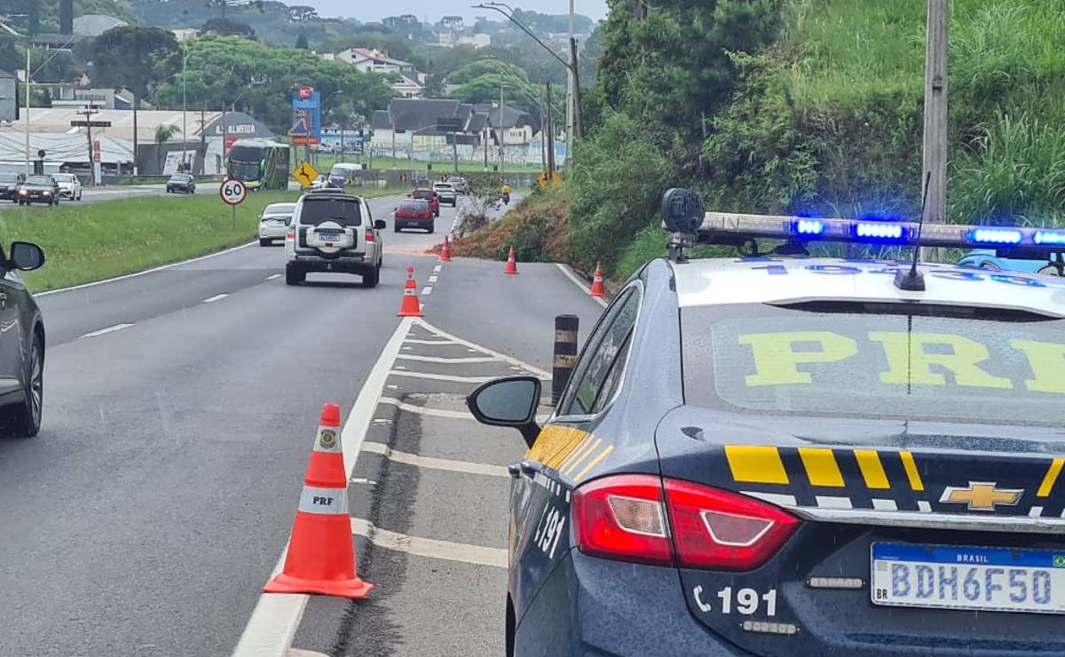 O deslizamento de terra atingiu uma alça de acesso da rodovia e afeta o trânsito de quem chega a Curitiba. A área foi isolada e a PRF orienta o trecho.