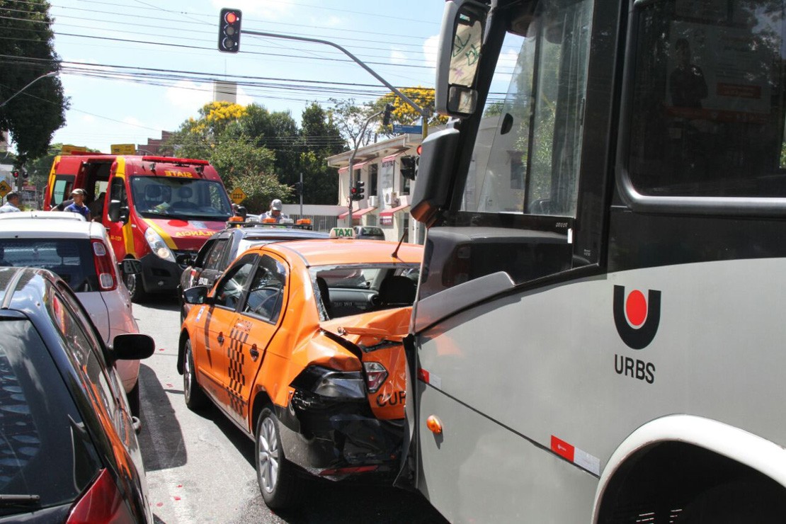 Um engavetamento entre veículos, incluindo um ônibus Ligeirinho, no bairro Alto da XV, em Curitiba, deixou o trânsito em meia pista na Rua Professor Brandão, na esquina com a Padre Germano Meyer. A colisão aconteceu por volta das 10h da manhã desta quinta-feira (1º).