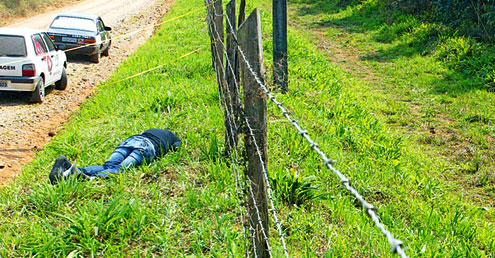Porém, levou cinco tiros e tombou morta no barranco. Ela tinha aproximadamente 25 anos, vestia calça jeans e blusa cinza. Próximo aos corpos, foram recolhidas cápsulas de pistola calibre nove milímetros.