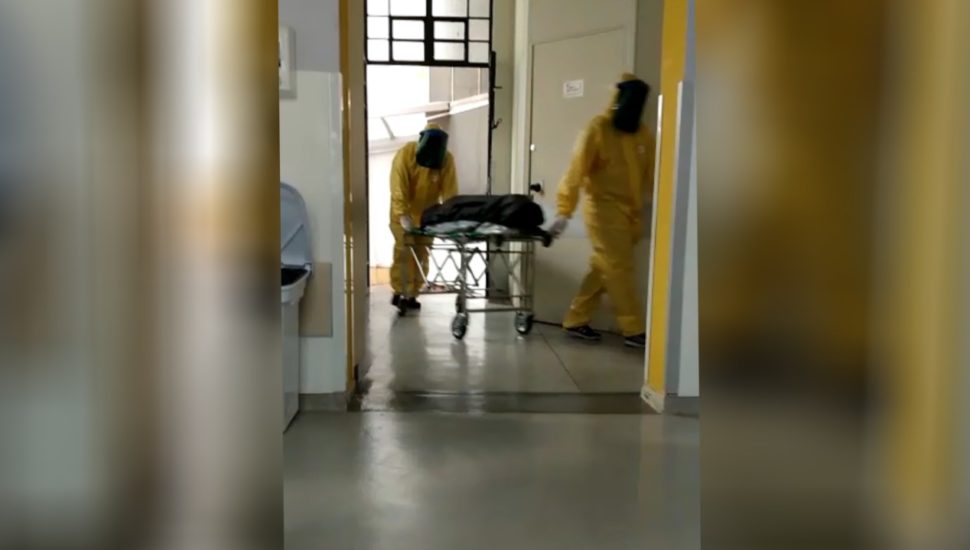 Atenção! Anda circulando pelas redes sociais um vídeo de uma suposta vítima fatal de coronavírus (Covid-19) no Hospital Santa Casa de Curitiba, mas tudo não passa de fake news. Numa imagem que mais parece de ficção científica, um corpo que está sobre uma maca em um saco preto é transportado por duas pessoas vestindo roupas de proteção amarela.
