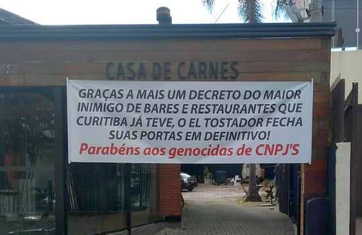 “Graças a mais um decreto do maior inimigo de bares e restaurantes que Curitiba já teve, o El Tostador fecha suas portas em definitivo. Parabéns aos genocidas de CNPJ’s”.
