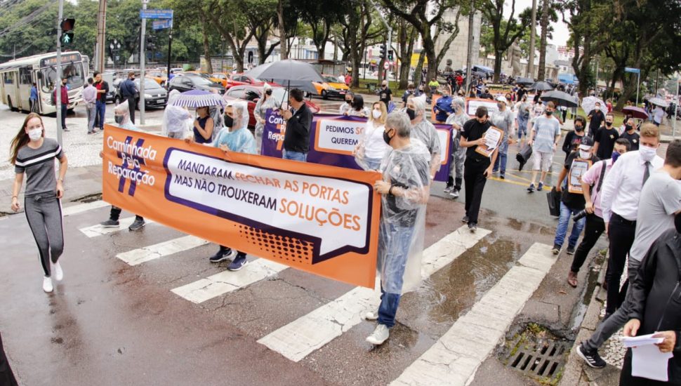Cerca de 250 pessoas entre empresários e funcionários dos setores de alimentação fora do lar, hospitalidade e promotores de eventos fazem uma manifestação na tarde desta quarta (24), em Curitiba, pedindo a reparação dos gastos que tiveram nos últimos 11 meses de pandemia. A caminhada, com faixas, cartazes e um carro de som, saiu da Praça 19 de Dezembro, no Centro Cívico, em direção à prefeitura e ao Palácio Iguaçu.
