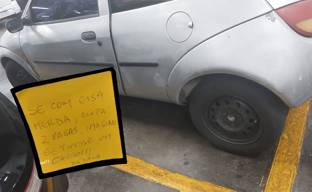 Um bilhete indelicado deixado por uma pessoa no vidro de um carro estacionado em um supermercado de Curitiba está dando o que falar nas redes sociais. Enfurecida por supostamente perder uma vaga no estabelecimento, a pessoa deixou num bilhete uma mensagem pesada. “Se com esta merda, ocupa duas vagas, imagine se tivesse um carro. Babaca!!!”, diz o recado colado no vidro de um Ford Ká.