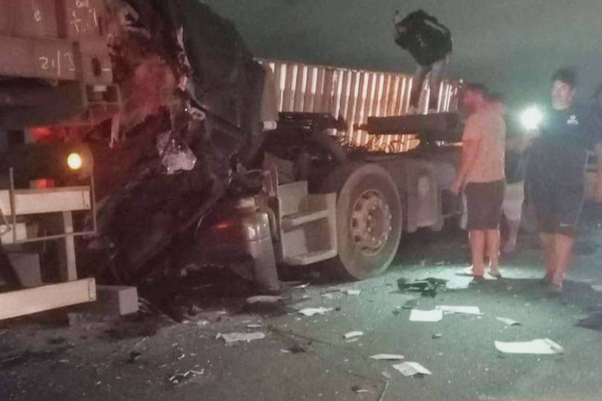 De acordo com o Corpo de Bombeiros, o contêiner de um dos caminhões atingidos caiu sobre a cabine ocupada pelo motorista que não resistiu aos ferimentos.