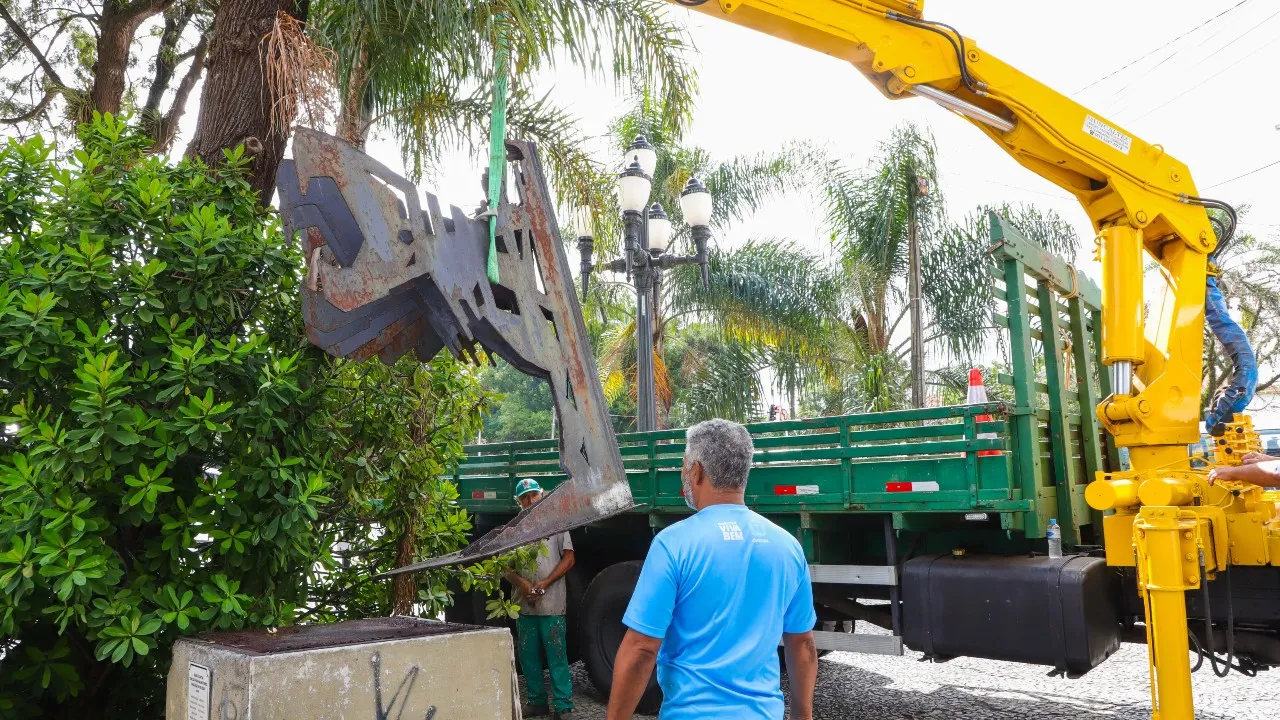 Instalada em 1978, a escultura em ferro, nunca antes restaurada, apresenta sinais de oxidação. A peça foi removida nesta terça-feira (09) e encaminhada ao Ateliê de Escultura do Memorial Paranista, onde será submetida a cuidados especializados.