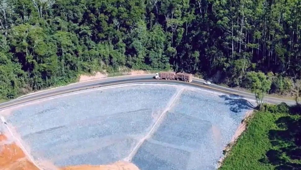 Na rodovia, foi realizado o retaludamento do aterro, com remoção de solo mole e aterro com solo novo, segundo o DER, resultando em quatro níveis de talude separados por três plataformas, sendo a camada mais externa composta por brita compactada para garantir estabilidade e proteção contra a ação do clima.