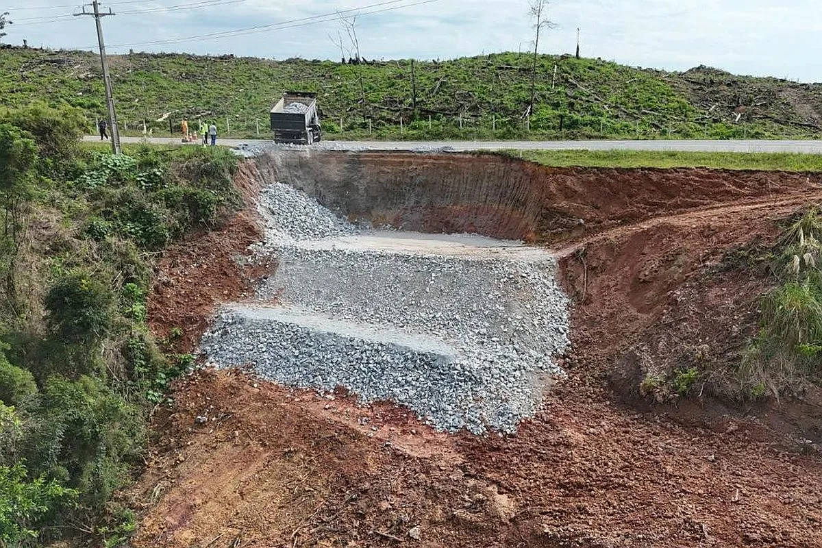 A obra foi contratada emergencialmente e deve ser concluída até junho, um investimento de R$ 1.712.637,00. Nesta primeira etapa é feita a terraplenagem, iniciando pelo corte do terreno rompido, removendo a camada mais superficial de solo, seguida por reaterro com rochas de 30 centímetros, compactadas e intertravadas por camadas de bica corrida.
