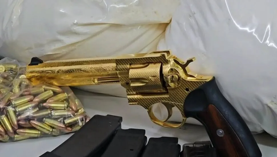 Revolver banhado a ouro foi encontrado na residência localizada no bairro Cajuru, em Curitiba. Foto: Divulgação/PMPR