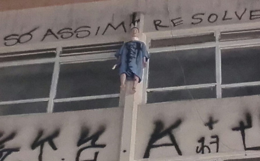 Dentro da faculdade, há ainda outra frase pichada com a inscrição “Deixe o boneco até 48 HRS e ñ voltaremo mais aki” (sic). De acordo com funcionários da Camões, os rapazes estavam ouvindo som alto nas primeiras horas da manhã, quando eles chegaram para trabalhar. A PM foi acionada logo em seguida.