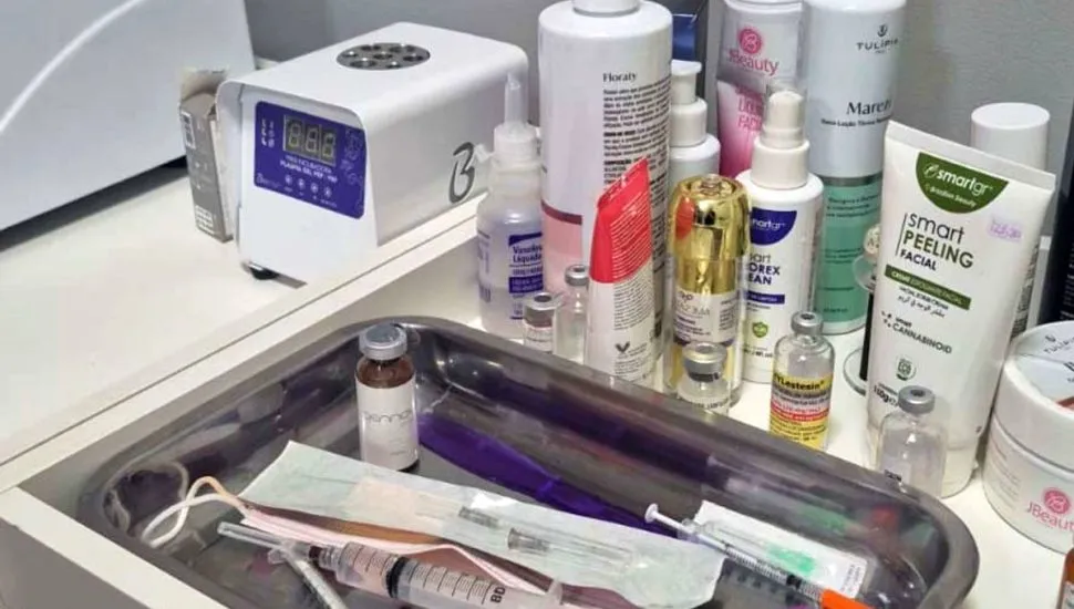 Durante a vistoria, os policiais apreenderam uma grande quantidade de medicamentos injetáveis sem procedência, produtos sem rótulo, medicamentos vencidos e ampolas de ácido hialurônico sem registro na Anvisa. Também foram encontrados botox de uma marca proibida no Brasil, equipamentos de ozonioterapia e uma incubadora para plasma PRP sem certificação, além de tubos de PRP com validade expirada.