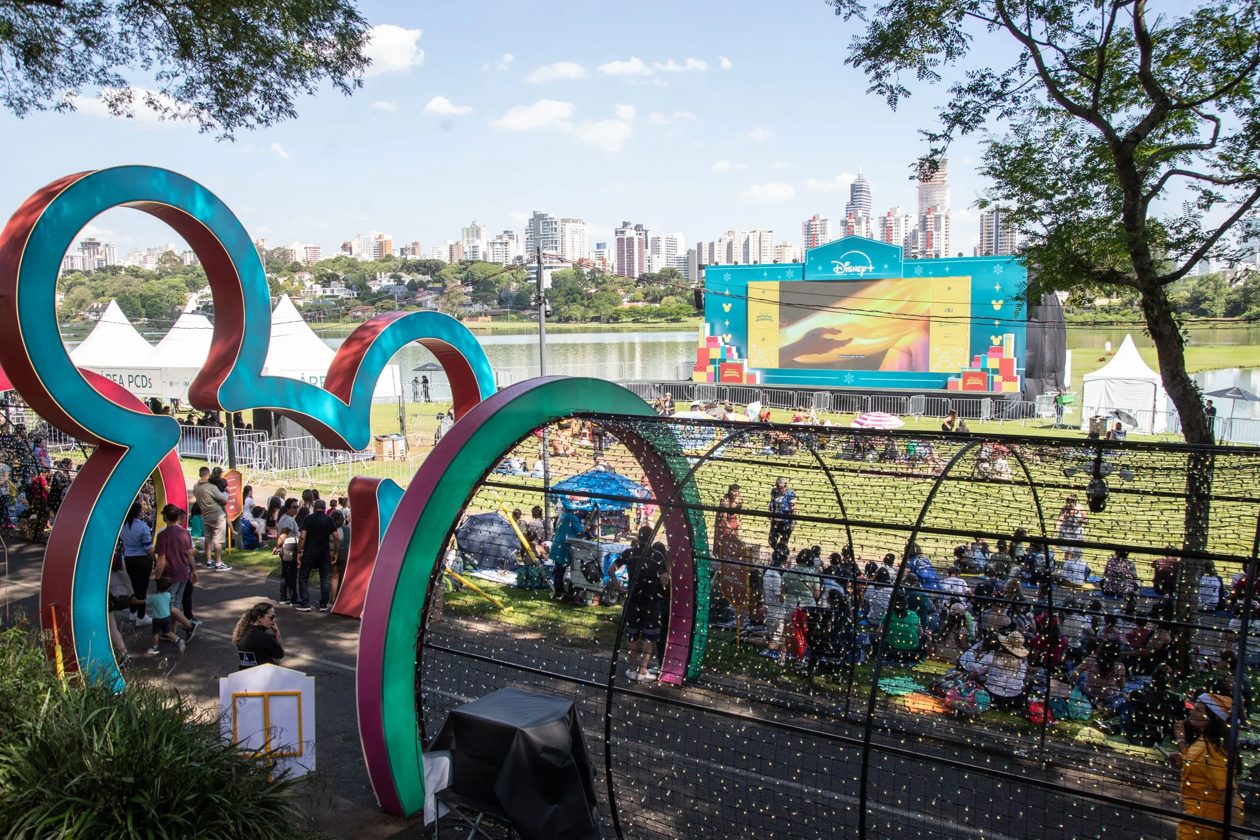 Centenas de famílias curitibanas e turistas se reuniram no Parque Barigui nesta sexta-feira (5/12) para a estreia do Disney+ Open Air, atração do Natal de Curitiba que oferece sessões gratuitas de cinema ao ar livre. O evento, que acontece de 5 a 23 de dezembro, exibe filmes clássicos da Disney diariamente às 9h30, 15h e 19h.