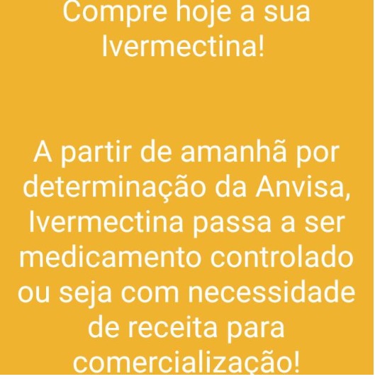 Até por volta das 13h desta sexta, quem entrava em contato pelo WhattApp da Nissei Express ainda podia ver a “campanha” publicada na foto do perfil do aplicativo, com fundo amarelo e texto em fonte de cor branca destacada. O texto da imagem era: “Compre hoje a sua Invermectina. A partir de amanhã por determinação da Anvisa, Invermectina passa a ser medicamento controlado ou seja com necessidade de receita para a comercialização”.