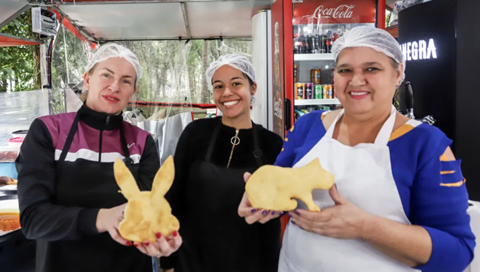 Um dos principais atrativos da feira é a gastronomia variada, com opções para todos os gostos, de comida regional até inspirada na culinária de outros países. Na edição de Páscoa deste ano, um clássico reinventado chama atenção: é a pizza frita em formato de capivara e de coelho, na barraquinha da Família Nielski.