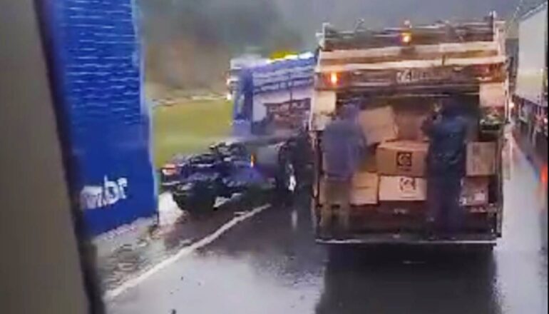 Um vídeo que circula nas redes sociais foi gravado por um caminhoneiro mostra que o caminhão da coleta está cheio de caixas que aparentemente saíram de um caminhão que está parado na rodovia.