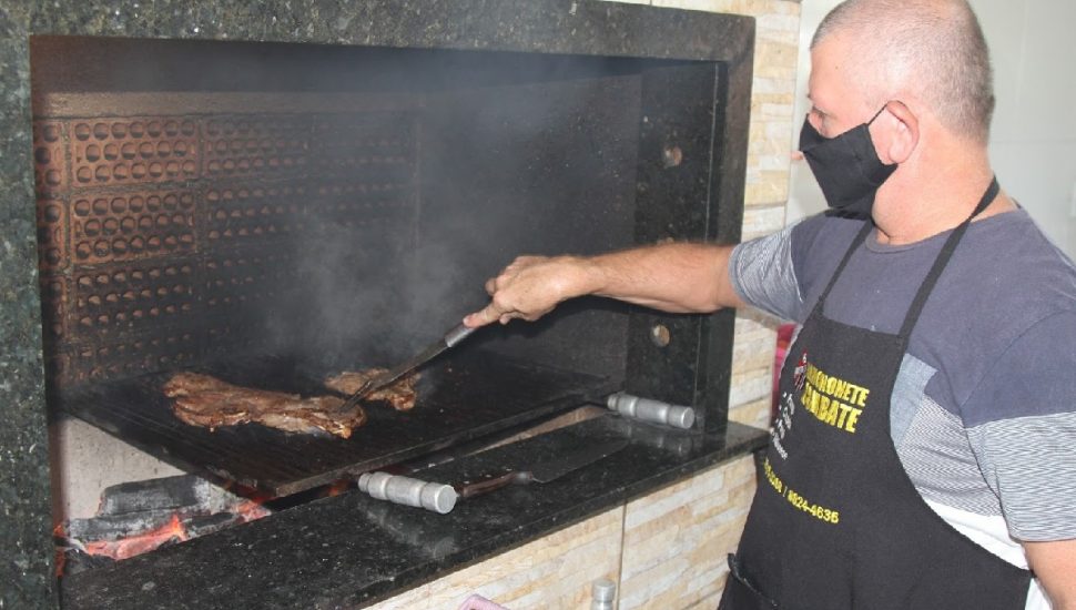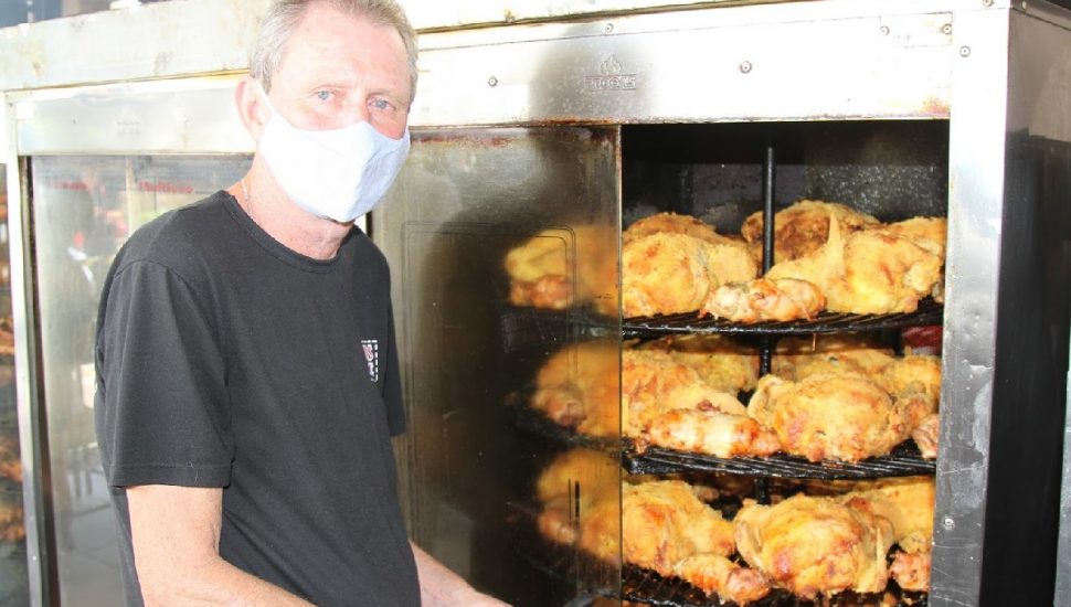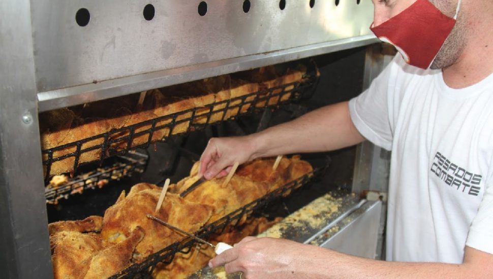 Depois de deixar o frango marinando no tempero durante a noite, a responsabilidade de pegar a ave e passar no fubá é do Erlei Raul Ronfeld, 56 anos, morador da Barreirinha. Ele chega no trabalho às 4h30 da manhã e começa a empanar todos os frangos para depois colocar no forno (hoje são oito) ao lado do Gustavo, filho do Nilton. Além do tradicional frango que costuma pesar dois quilos e custar R$38 a unidade, outras carnes consideradas mais nobres também são assadas e precisam ser manuseadas com atenção.