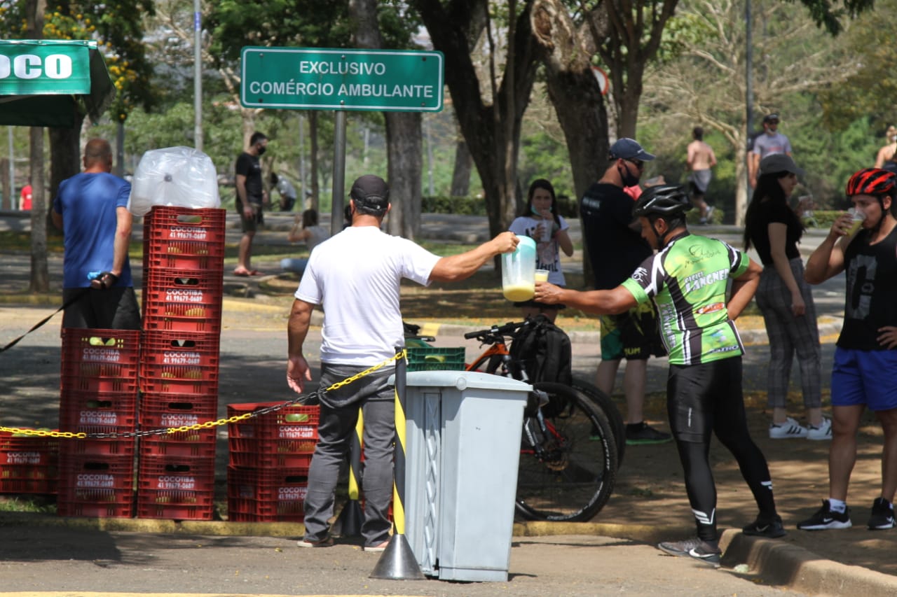 Os comerciantes ambulantes comemoram o tempo quente e o retorno gradativo das pessoas nas áreas de lazer, que permite recuperar um pouco o prejuízo causado pela pandemia. Rosildo Dantas, 46 anos, é proprietário de uma barraca de caldo de cana e coco no Barigui. Antes da pandemia, chegava a vender 720 copos de caldo de cana eu um dia quente. Agora, em dias como este sábado de calor, não vende nem metade disso.