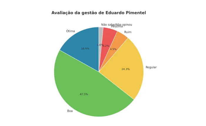 A avaliação da gestão de Pimentel foi considerada “ótima” por 16,9% dos entrevistados e “boa” por 47,5%. Já 24,3% classificaram a administração como “regular”. As avaliações negativas (“ruim” e “péssima”) somaram 9,7%, com 4,5% e 5,2%, respectivamente. 1,6% dos entrevistados não responderam ou não opinaram.