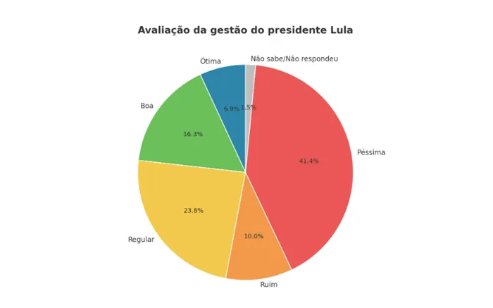 Comparando com os resultados de abril de 2025, a aprovação do presidente Lula subiu de 29,3% para 33,7%. As avaliações “ótima” e “boa” também aumentaram, passando de 5,3% e 13,2% para 6,9% e 16,3%, respectivamente.