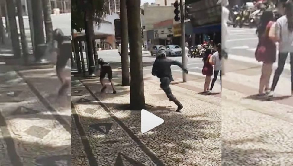 A cena é semelhante à defesa de um jogador de futebol americano, quando o atleta derruba o oponente em alta velocidade. No entanto, não foi em um estádio lotado, mas sim na Praça Osório, Centro de Curitiba, na tarde de quarta-feira (03). Um guarda municipal do Grupo Tático de Motos (GTM) pulou com os braços abertos em direção a um jovem suspeito de ter roubado uma corrente do pescoço de uma pedestre nas proximidades da Praça da Espanha, também em Curitiba.