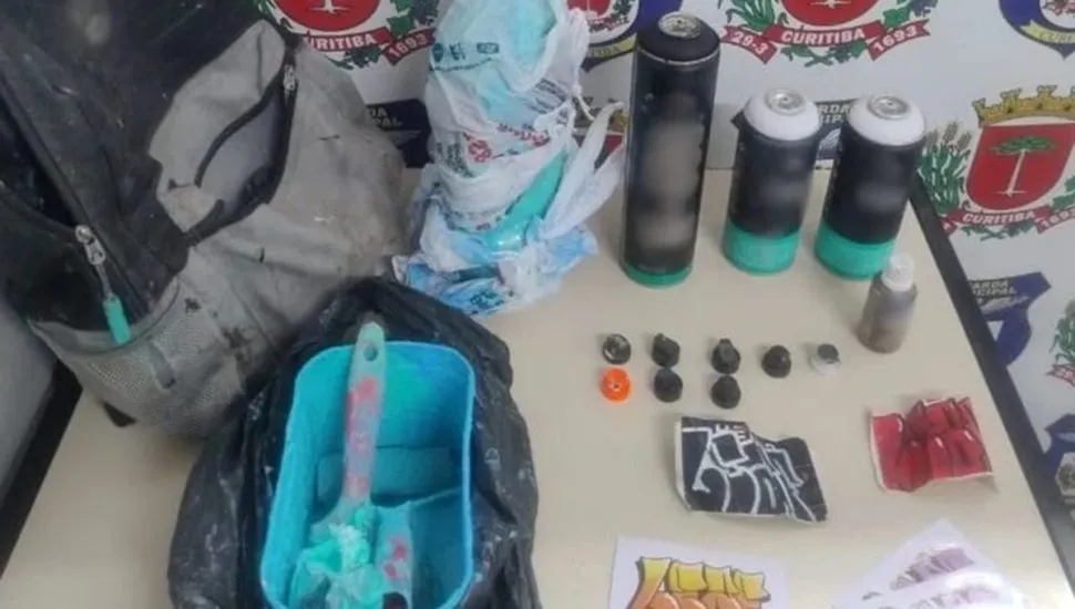 Ao chegarem ao local indicado, os agentes flagraram os suspeitos pichando o muro de um imóvel particular. Durante a abordagem, foram apreendidos materiais utilizados na ação, incluindo latas de tinta spray, corante, adesivos, pincéis e um rolo com tinta verde. Os homens apresentavam marcas de tinta nas mãos compatíveis com as cores usadas no muro.