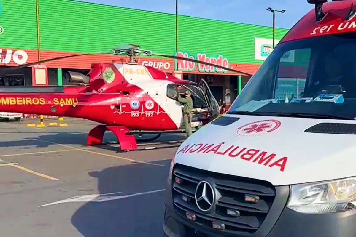 Um helicóptero do Batalhão de Polícia Militar de Operações Aéreas (BPMOA) precisou pousar em um estacionamento do supermercado Harger Atacado e Varejo, na manhã desta sexta-feira (16), em Araucária, na Região Metropolitana de Curitiba, para atender uma ocorrência de trânsito.