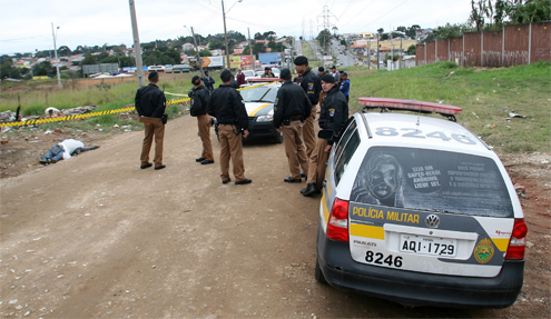 O dia estava quase raiando, quando um homem, identificado apenas como Fernando, foi assassinado com cinco tiros na Rua Gertrudes Cruz de Andrade, ontem, no Pinheirinho. Segundo Erica dos Santos, a vítima estava com ela e mais uma garota, no meio de um matagal, usando drogas, minutos antes dos tiros. Ela contou que o assassino estava em um Gol branco.