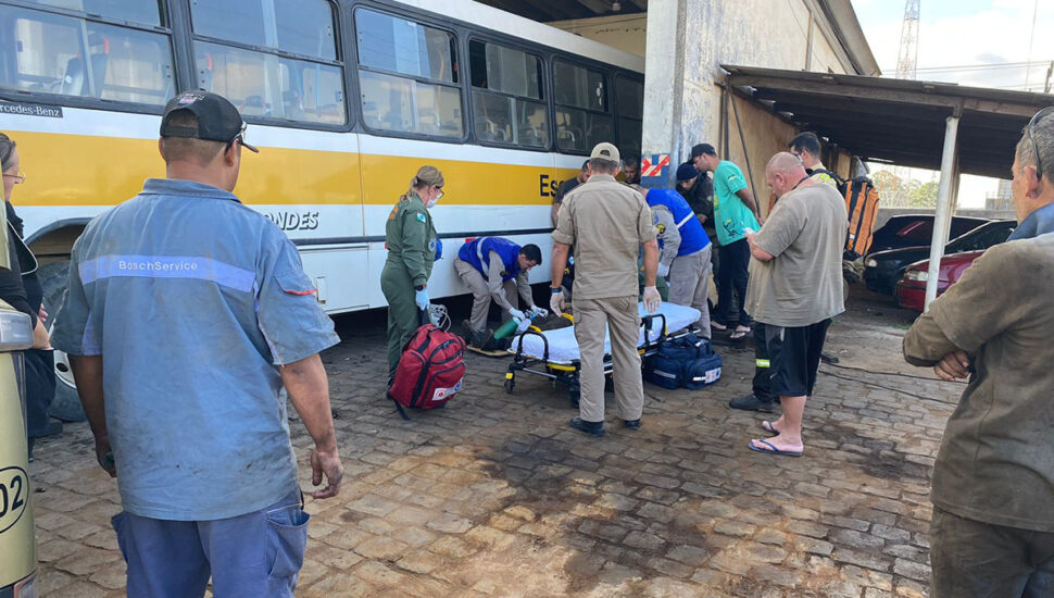 Segundo a Polícia Militar (PM), a vítima foi socorrida pelo helicóptero do Batalhão de Operações Aéreas da PM (BPMOA). Segundo informações, homem realizava o conserto do veículo quando o equipamento hidráulico que sustentava o ônibus escapou. A vítima ficou prensada.
