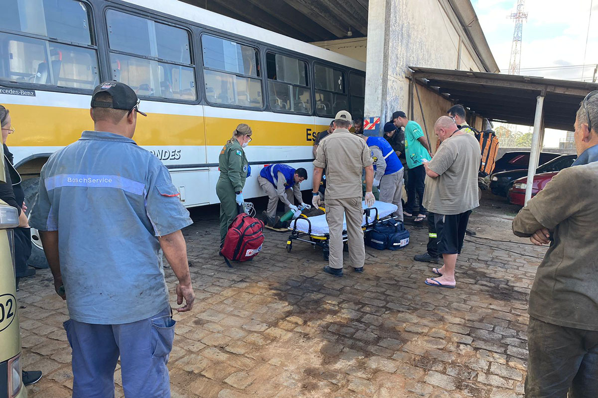 Segundo a Polícia Militar (PM), a vítima foi socorrida pelo helicóptero do Batalhão de Operações Aéreas da PM (BPMOA). Segundo informações, homem realizava o conserto do veículo quando o equipamento hidráulico que sustentava o ônibus escapou. A vítima ficou prensada.