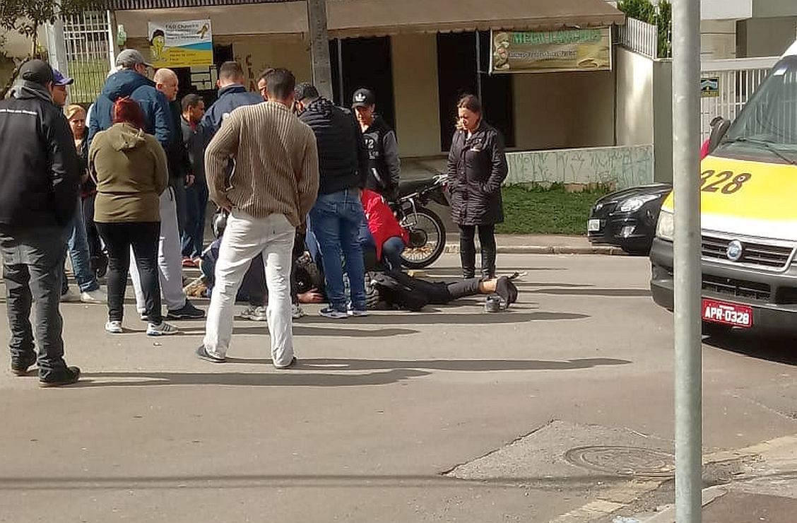 Um motociclista de aproximadamente 25 anos ficou gravemente ferido no fim da manhã desta terça-feira (10) após se envolver numa colisão com um carro na esquina das ruas João Reffo e Renascença, no bairro Santa Felicidade, em Curitiba. Com o impacto, o homem perdeu todos os dentes, segundo testemunhas que presenciaram a colisão.