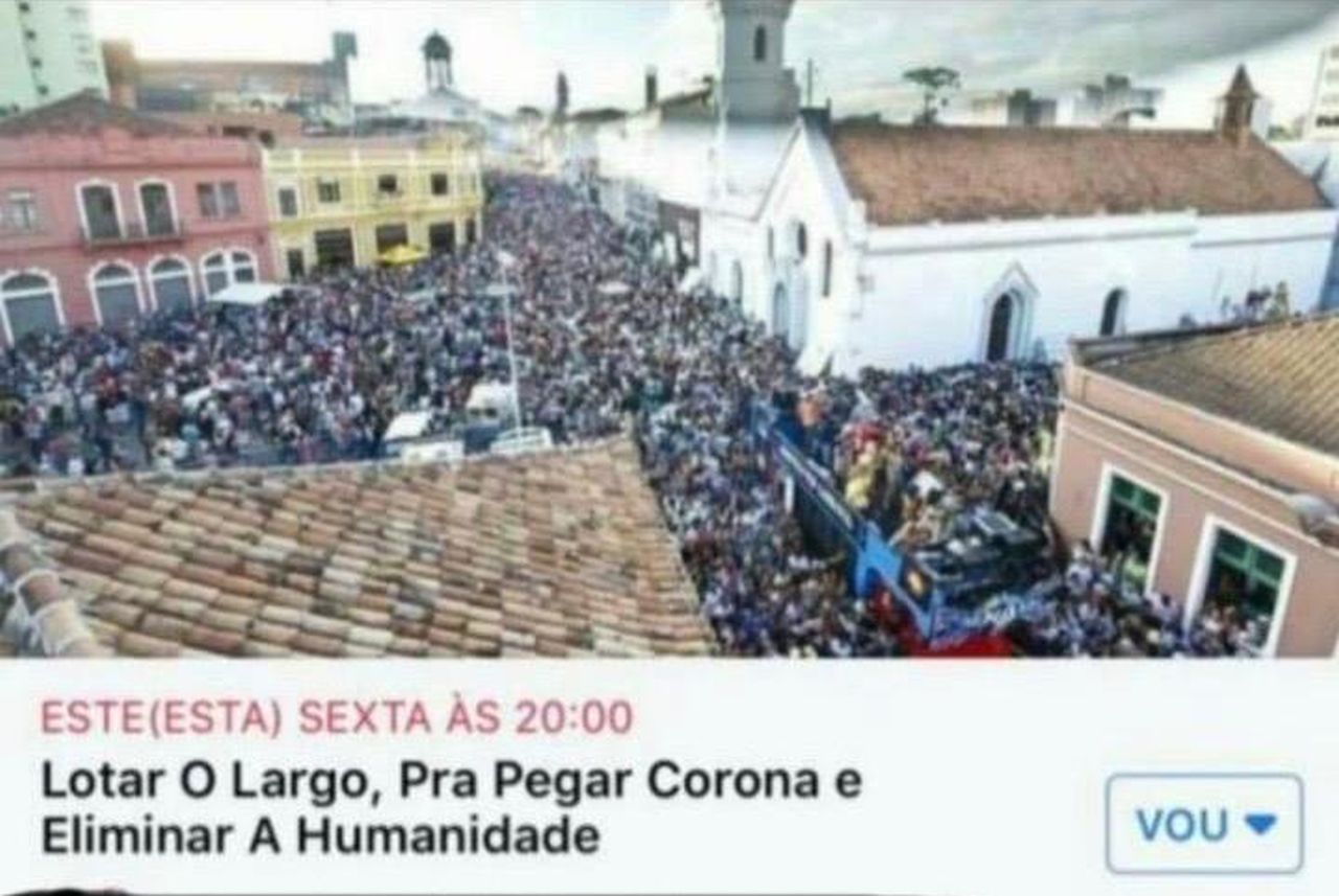 Um homem de 24 anos foi ouvido nesta quarta-feira (18) pela Polícia Civil do Paraná (PCPR) por criar um evento no Facebook com o objetivo de propagar o coronavírus por Curitiba. O rapaz teria marcado um encontro no Centro da cidade e sete pessoas já tinham confirmado presença. O “responsável” pelo evento foi liberado e poderá ser preso por até um ano.