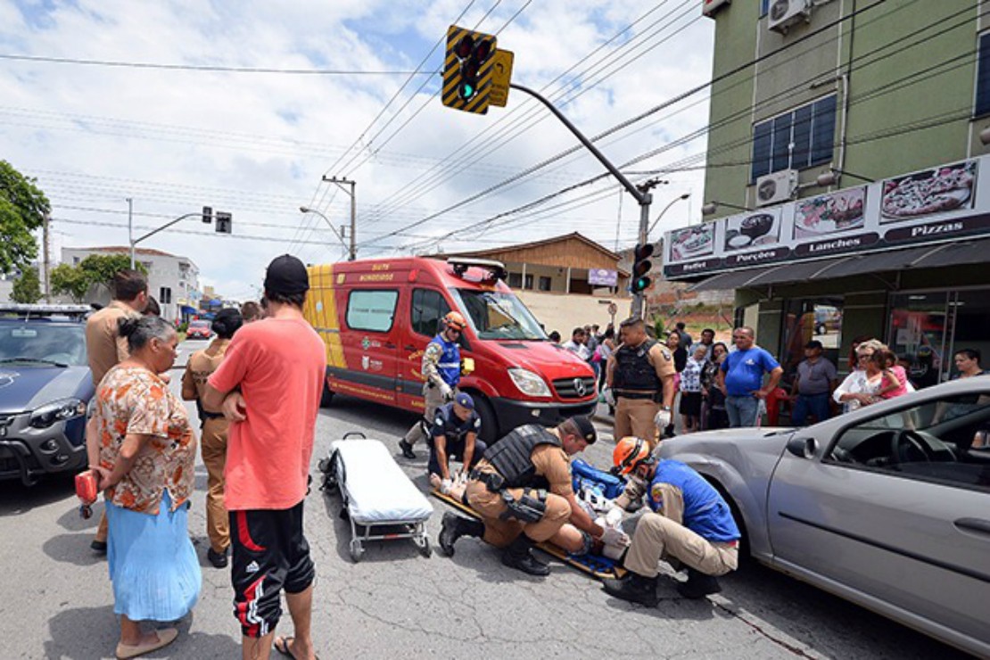 Uma mulher, de 65 anos, foi atropelada na tarde desta quinta-feira (7), na Rua Coronel João Antônio Xavier, no Centro de Araucária, município da Região Metropolitana de Curitiba (RMC). De acordo com a polícia, ela tentava atravessar a rua, que tem tráfego em dois sentidos, mas não teria visto o sinal aberto para os carros em um dos lados da pista.
