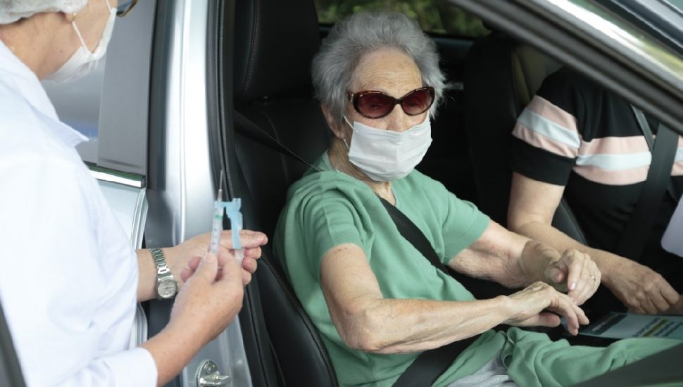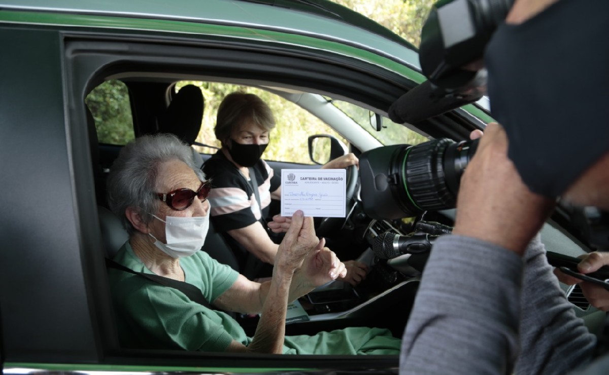 Quem também estava na fila para vacinação era dona Eloema Martins, de 96 anos. Ela estava animada com a vacinação e estava com a filha. “Foi uma sensação boa. A gente quer o melhor, ainda mais nessa fase da vida. Só de saber que é pra melhorar a gente fica feliz. Esse é mais um abacaxi que descascamos nesta vida”, brincou Eloema Martins, segunda vacinada do dia no drive-thru do Parque Barigui.