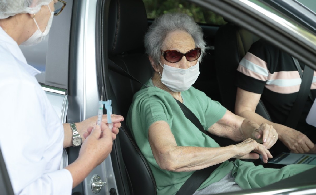 Quem também estava na fila para vacinação era dona Eloema Martins, de 96 anos. Ela estava animada com a vacinação e estava com a filha. “Foi uma sensação boa. A gente quer o melhor, ainda mais nessa fase da vida. Só de saber que é pra melhorar a gente fica feliz. Esse é mais um abacaxi que descascamos nesta vida”, brincou Eloema Martins, segunda vacinada do dia no drive-thru do Parque Barigui.
