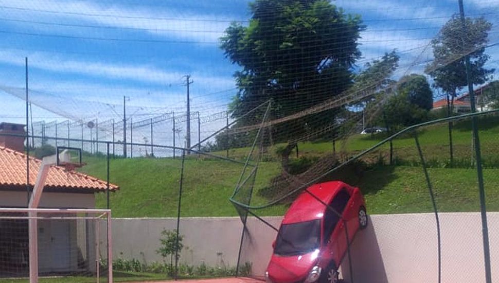 Um acidente inusitado chamou a atenção de quem passou pela Avenida Comendador Franco (Avenida das Torres) na tarde desta quarta-feira (03). Moradores de um condomínio localizado no bairro Uberaba foram surpreendidos quando um automóvel Nissan Tiida vermelho derrubou o alambrado e invadiu a quadra de esportes, despencando de uma altura de aproximadamente 2 metros.